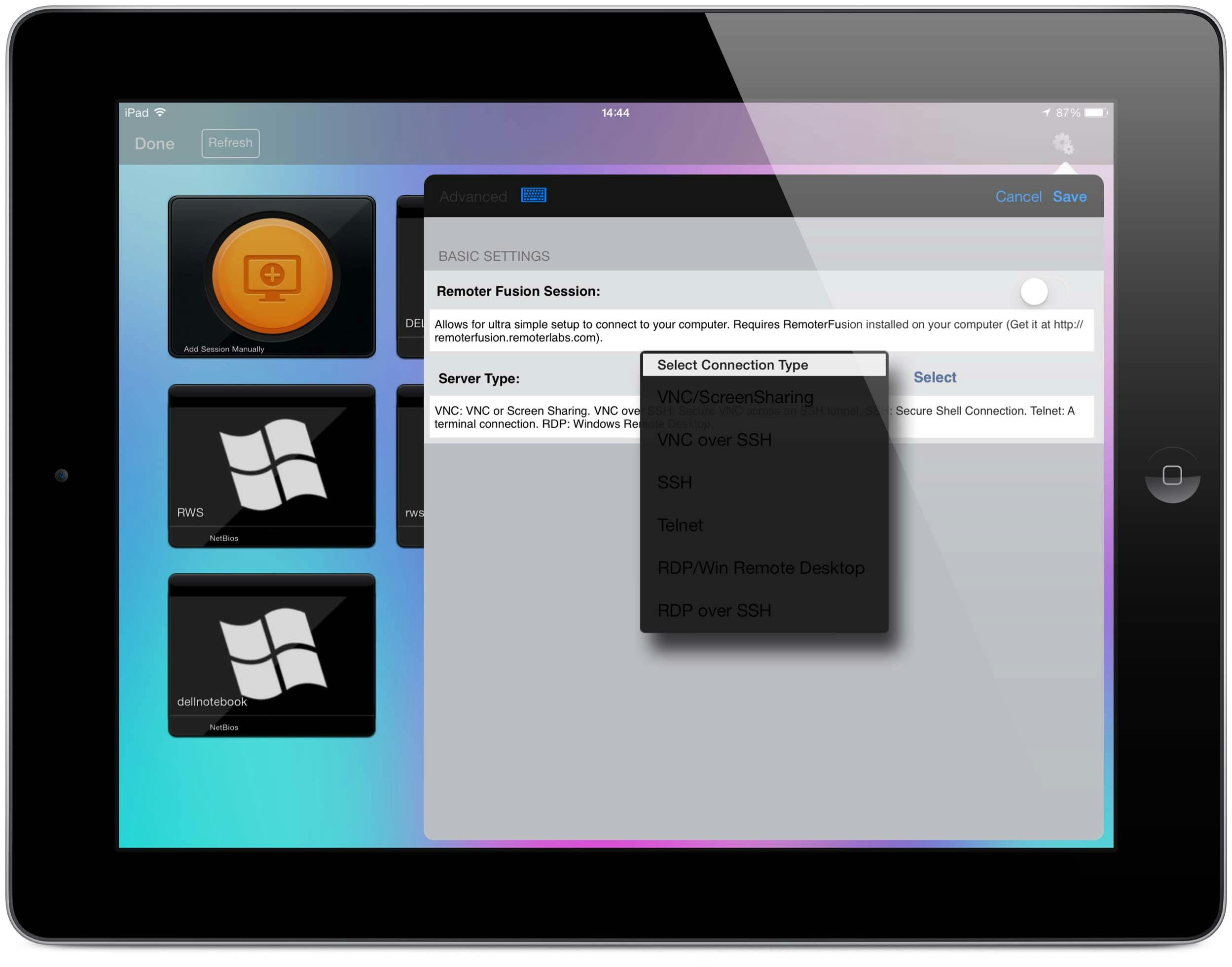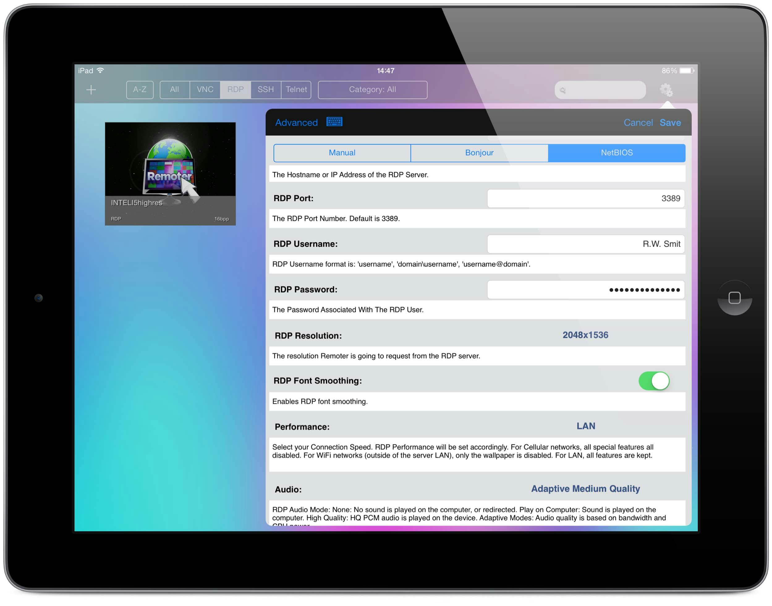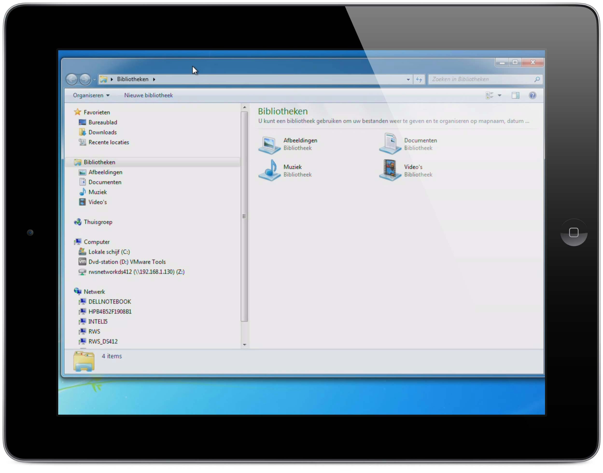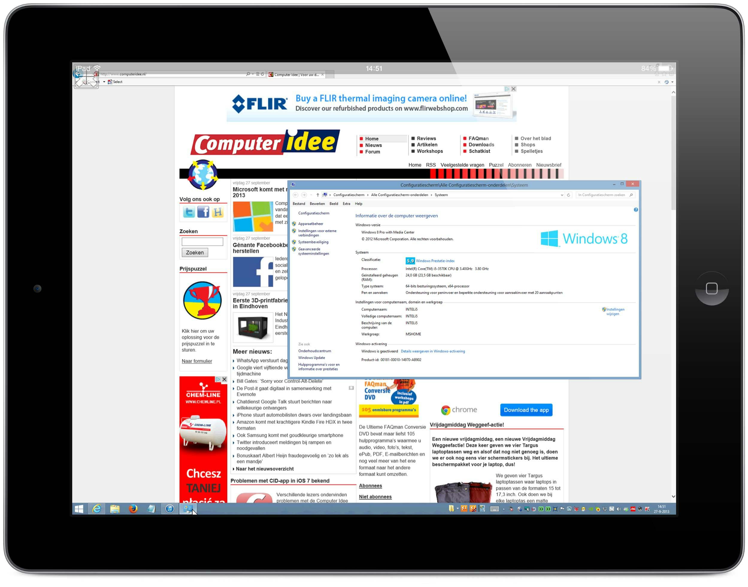 Installeer Remoter Pro (€8,99) op de iPad en start de app; druk op de ‘+’ voor het toevoegen van de pc. Als het goed is wordt uw pc al weergegeven met de netwerknaam die u ooit hebt gekozen, druk op het bijbehorende pictogram. Er ís een pc-tool beschikbaar, maar installeer deze voor de verandering eens niet. Druk in plaats daarvan op Select achter Server Type en kies vervolgens voor RDP/Win Remote Desktop. Vul achter RDP Username uw Windows gebruikersnaam in (die waar u mee inlogt dus) en achter RDP Password het bijbehorende wachtwoord. Achter RDP Resolution kunnen bezitters van een Retina-iPad gaan voor de heerlijk hoge resolutie van 2048 x 1536 pixels, een tandje lager mag natuurlijk ook. Schakel tot slot de optie RDP NLA in, helemaal onderaan het configuratieschermpje en druk dan op Save. Alle overige instellingen waaronder de RDP Port dient u te laten staan op de al gesuggereerde standaardwaarden. Om verbinding te maken met uw pc drukt u op het nieuw verschenen pictogram en kunt u aan de slag! Het is een iets ingewikkelder manier, maar technisch gezien wel de meest elegante.