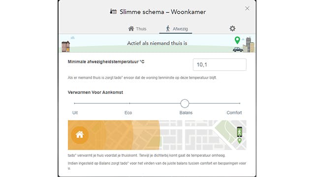 We hebben de app zowel op Android als iOS gebruikt en merkten nauwelijks een negatieve invloed op de accuprestaties, terwijl Tado toch vrij goed detecteerde wanneer we de testlocatie verlieten. Tado zet de verwarming automatisch lager bij afwezigheid, maar je kunt een ondergrens configureren in de (web)app. De slimme thermostaat zet de verwarming opnieuw aan wanneer je naar huis komt. Via de app kun je dit uitschakelen of in drie standen zetten: eco (begint pas te warmen wanneer je daadwerkelijk thuis bent); balans (verwarmt wanneer je het huis nadert); of comfort (de minst zuinige stand).