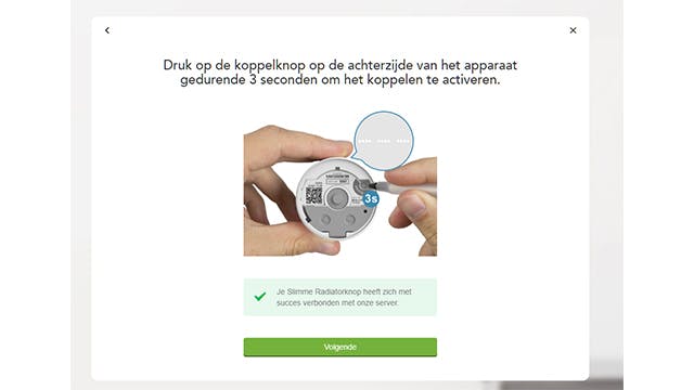 De tado-cloud waaraan de thermostaat gekoppeld wordt, werkt wel (ook) in het Nederlands. De piepkleine internetbridge koppel je aan je router. Het apparaatje betrekt zijn stroom van een usb-kabel die je ofwel in een vrije usb-poort van de router ofwel in een aparte usb-voeding prikt. Enkele seconden na het aansluiten detecteert de installatiewizard de aanwezigheid van de bridge. Vervolgens registreer je de Smart Thermostat door het serienummer en de authenticatiecode in te vullen. Op dezelfde manier koppel je de radiatorknoppen en/of eventuele extra kamerthermostaten.