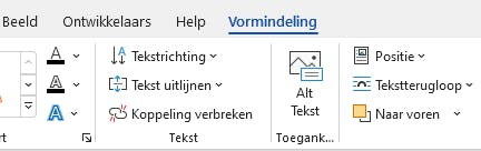 Als je later de tekstvakken wilt ontkoppelen, moet je het eerste tekstvak selecteren en daarna klik je in het tabblad Vormopmaak op Koppeling verbreken. Hierdoor zal alle tekst die in het tweede vak stond, volledig in het eerste tekstvak verschijnen.