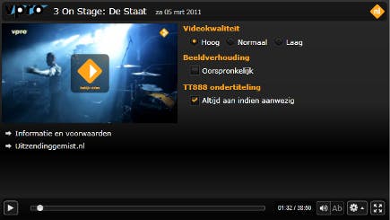 Hebt u een interessante serie of documentaire gevonden? Klik dan op Bekijk of op de titel van het betreffende programma. Vervolgens wordt er direct een webvideo gestart, maar voordat het daadwerkelijke programma begint verschijnt meestal eerst nog een advertentiefilmpje in beeld. Ga met de muisaanwijzer op het beeld staan en geef een dubbelklik. U bekijkt de webvideo nu op volledige schermgrootte. Als u met de muis beweegt, krijgt u opties in beeld waarmee u het filmpje kunt pauzeren of door kunt spoelen. Verder regelt u het volume en schakelt u desgewenst de ondertiteling in. Hapert uw beeld? Mogelijk is uw internetverbinding niet snel genoeg of vindt er te veel dataverkeer plaats. Mogelijk helpt het als u de beeldkwaliteit wat lager zet. Ga met de muis in het kader van de webvideo staan en navigeer naar het vierkantje, rechtsonder in beeld. Kies in het uitrolmenu voor de optie Instellingen. Hier kunt u de videokwaliteit, die standaard op Hoog staat, aanpassen naar Normaal of Laag. Eventueel geeft u aan dat u de ondertiteling standaard wilt inschakelen, mits die voor de betreffende uitzending aanwezig is. Controleer of de haperingen zijn verholpen door opnieuw op het vierkantje te klikken. Kijkt u via de oude versie van Uitzending Gemist? Klik dan rechtsboven in het dialoogvenster op Instellingen. Geef vervolgens aan of u over een snelle of langzame internetverbinding beschikt en bevestig met Sla op.