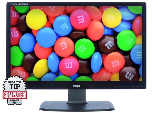 energieverbruik combineert met een goede beeldkwaliteit. De kleurreproductie is zonder kalibratie met een Delta E van 4,5 redelijk. Na kalibratie is ook dit scherm uitstekend geschikt voor foto- en videobewerking. Het contrast van het scherm is opvallend goed, we meten een waarde van 1269:1 na kalibratie. Het scherm beschikt ook over een dynamisch contrast, deze staat standaard uit. De zwartwaarde van het scherm is met een gemeten waarde van 0,10 erg laag, zwart is dan ook echt zwart. Daarnaast is er geen sprake van lichtlekkage. De beeldkwaliteit van het scherm is voor zowel foto's als video's zeer goed. Het scherm is door zijn matige responstijd minder geschikt voor snelle games. Zoals we mogen verwachten van een led-scherm is het energieverbruik bij de XB2472HD laag. Met de eco-functie is het verbruik slechts 20,3 watt. Ergonomie ontbreekt niet, het scherm kan in hoogte worden versteld en gedraaid met de stevige voet. De pivot-functie zorgt dat het scherm in een handomdraai van landschap- naar portretstand wordt gedraaid. Het OSD-menu is eenvoudig, gelukkig is het wel voorzien van een aspect-functie om een 4:3-beeldverhouding ongewijzigd weer te geven. Het scherm heeft een DVI, HDMI en een analoge VGA-aansluiting, maar DisplayPort ontbreekt. De ProLite XB2472HD van iiyama is een aanrader, met een goed contrast, ergonomie en een goede beeldkwaliteit. Tot slot is de prijs van ongeveer 220 euro ook erg prettig.