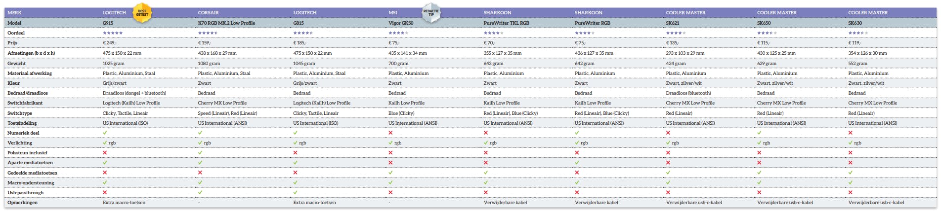 Aan het andere uiteinde is de Logitech G915 met zijn draadloze functie en uitgebreide mogelijkheden indrukwekkend, zelfs als de prijs wel heel extreem is. De Cooler Master SK621 is ook een positieve opvaller omdat hij het enige betaalbare draadloze model is, en ook nog eens supercompact is.