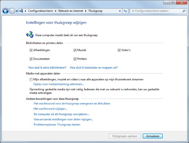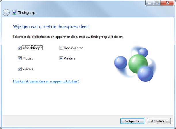 In de vorige stap las u over de mogelijkheid om de computer uit de thuisgroep te verwijderen. Een tussenweg is ook mogelijk: hierbij past u aan welke items moeten worden gedeeld. Mogelijk hebt u zich in de loop van de tijd bedacht en wilt u bijvoorbeeld niet dat apparaten worden gedeeld. In de wizard uit stap 13 klikt u dan op De computer niet uit de thuisgroep verwijderen, maar wijzigen wat ik deel. Selecteer vervolgens de bibliotheken en apparaten die u met uw thuisgroep wilt delen. Klik achtereenvolgens op Volgende en Voltooien.