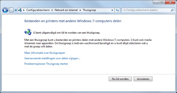 Nu begint het fijne werk: andere computers toevoegen aan uw zojuist gemaakte thuisgroep. Zorg ervoor dat de hoofdcomputer - waarop u de thuisgroep hebt gemaakt - is ingeschakeld en niet in de slaapstand of stand-bymodus staat. Op de computer die u wilt toevoegen, opent u het Configuratiescherm. Typ thuisgroep in het zoekvak rechtsboven en druk op Enter. Windows 7 merkt dat er al een thuisgroep actief is en maakt hiervan melding. Klik op de knop Nu lid worden.