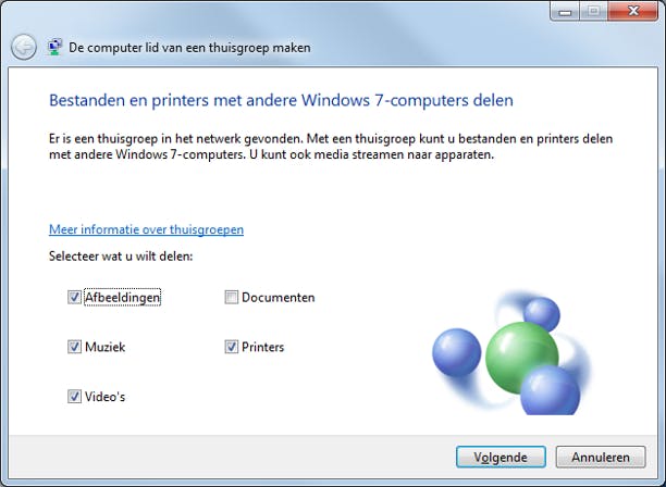 Vervolgens geeft u aan welke onderdelen u binnen de thuisgroep wilt delen. Dit kan per computer verschillen. U kiest hierbij uit Afbeeldingen, Muziek, Video's en Documenten. Daarnaast kunt u de printer delen. In tegenstelling tot bij een netwerkprinter, is het bij een gedeelde printer via een thuisgroep noodzakelijk dat de computer waarop de printer is aangesloten, aan staat tijdens het afdrukken. Mogelijk wilt u nog andere mappen delen. In stap 5 van deze workshop geven we preciezer aan wat er gedeeld kan worden.