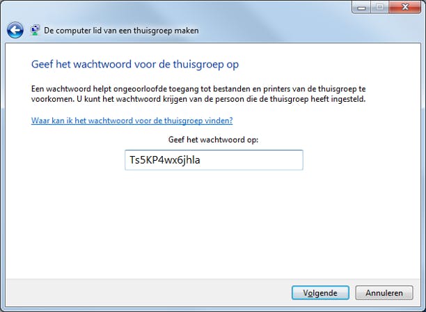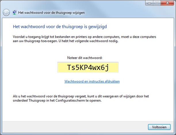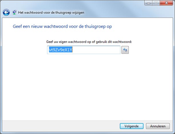 Het standaardwachtwoord voor de thuisgroep kunt u aanpassen. Zorg er eerst voor dat alle computers in uw thuisgroep zijn ingeschakeld. Dit is nodig om het wachtwoord op de andere pc's aan te passen. In het hoofdvenster van Thuisgroep klikt u op Het wachtwoord wijzigen (in de sectie Andere bewerkingen voor deze thuisgroep). Kies voor Het wachtwoord wijzigen. Geef een sterk wachtwoord op. Met de knop naast het wachtwoordvak kunt u Windows automatisch wachtwoorden laten genereren. Klik op Volgende. Het wachtwoord is gewijzigd.