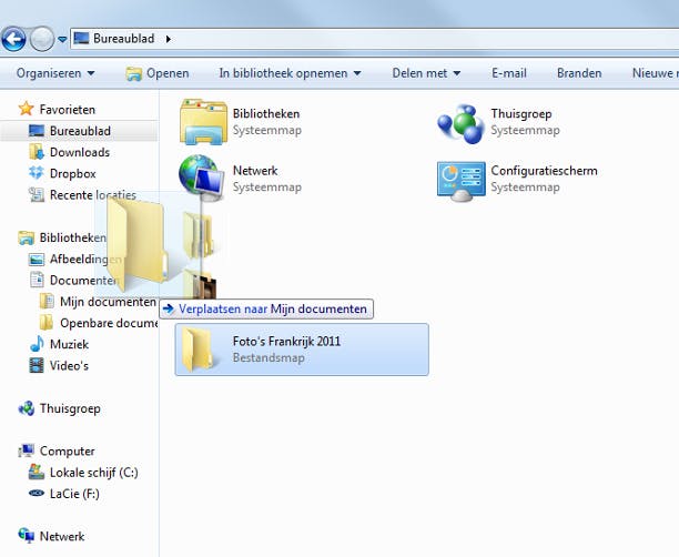 Nu de computers met elkaar in verbinding staan via de thuisgroep, is het tijd om te bepalen welke bestanden u toegankelijk wilt maken. Dit kan op twee manieren. Allereerst kunt u de bestanden die u wilt delen, verplaatsen naar een van de bibliotheken die via thuisgroepen worden gedeeld. Bijvoorbeeld de map Documenten. Open de oorspronkelijke locatie in een Verkenner-venster en open in een ander venster de gedeelde bibliotheek. Sleep de bestanden van de bronlocatie naar de gedeelde thuisgroepmap. De bestanden zijn nu beschikbaar in het netwerk.