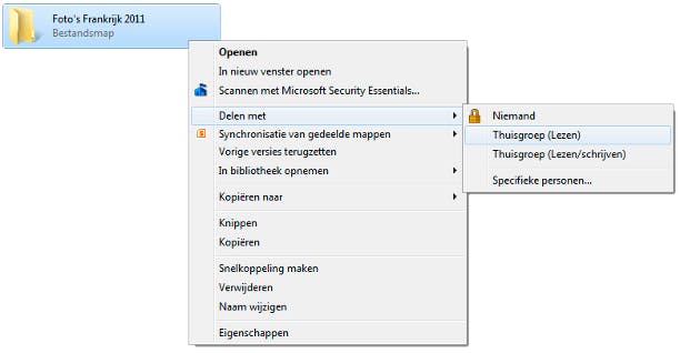 De andere manier om bestanden te delen is door de map direct te delen met de thuisgroep. Voordeel hiervan is dat u de locatie van de map niet hoeft aan te passen. Open de verkenner (Windows-toets+E) en navigeer naar de locatie met de map die u wilt delen. Klik vervolgens met de rechtermuisknop op de map en kies Delen met. Kies tussen Thuisgroep (Lezen) of Thuisgroep (Lezen/schrijven). In het laatste geval mogen de andere gebruikers ook wijzigingen doorvoeren, terwijl u met de eerste optie alleen toestemming geeft om de inhoud van de map te bekijken.