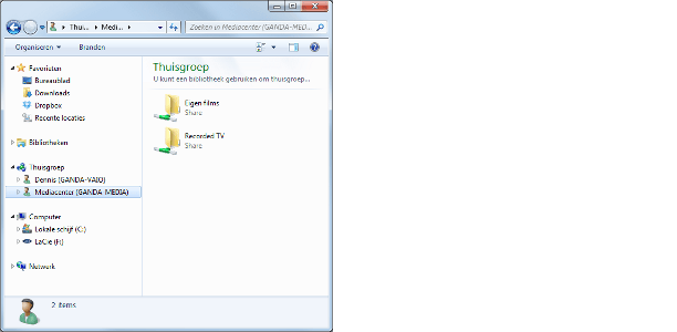 Zodra de thuisgroep is geactiveerd, wordt Windows Verkenner uitgebreid met het onderdeel. Open Windows Verkenner, aan de linkerkant van het venster ziet u de vermelding Thuisgroep. Klik hierop om een overzicht van de aanwezige computers op te vragen. Klik op een computer om de beschikbare mappen te zien. Bij een standaardconfiguratie zijn dit de bibliotheken zoals Afbeeldingen en Muziek. Afhankelijk van de rechten die u in de mappen op andere computers hebt, kunt u bestanden toevoegen, verplaatsen, kopiëren en verwijderen, en nieuwe bestanden en mappen maken.