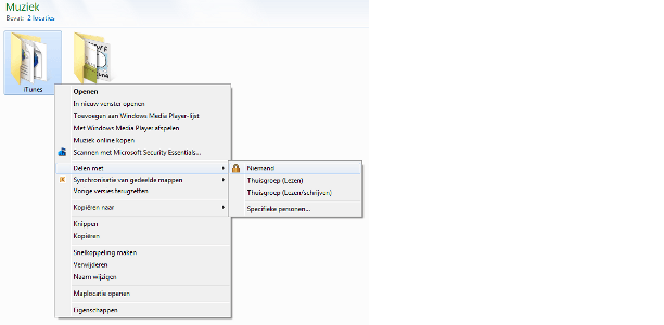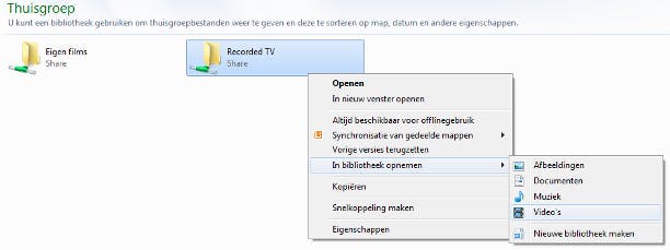 Grote kans dat u van specifieke mappen binnen de thuisgroep veel gebruikmaakt. Deze mappen maakt u eenvoudig toegankelijk door ze toe te voegen aan uw lokale bibliotheken. Bibliotheken in Windows 7 kunt u beschouwen als dynamische mappen, die verwijzingen naar andere mappen bevatten. Ze zijn snel toegankelijk vanuit alle programma's. Klik met de rechtermuisknop op de map die u toegankelijk wilt maken en kies In bibliotheek opnemen. Selecteer de gewenste lokale bibliotheek of kies voor Nieuwe bibliotheek maken.