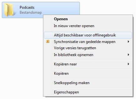 Mappen in een thuisgroep zijn alleen beschikbaar als de computer waarop de map zich bevindt, is ingeschakeld. Als u gebruikmaakt van Windows 7 Home Premium of Ultimate, kunt u de thuisgroepmappen van een andere computer offline beschikbaar maken. Als de map dan niet toegankelijk is, hebt u nog altijd de beschikking over de offline variant. Bijvoorbeeld als uw laptop met de mappen op kantoor staat. Op de computer waarop u de mappen beschikbaar wilt maken, klikt u met rechts op de thuisgroepmap en kiest u voor Altijd beschikbaar voor offlinegebruik.