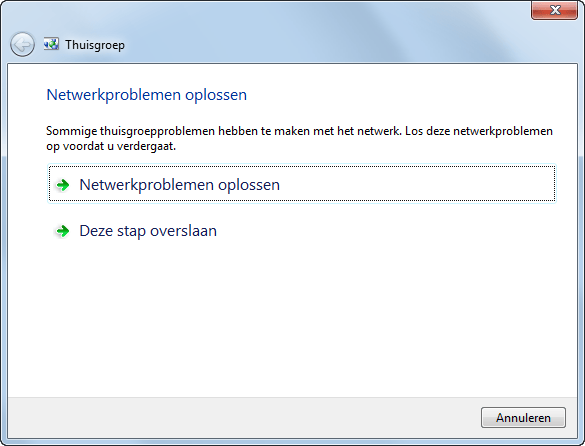 Levert de thuisgroep problemen op, bijvoorbeeld omdat u de andere computers niet kunt zien of omdat de toegang tot bestanden en mappen wordt geblokkeerd? U kunt gebruik maken van de Probleemoplosser Thuisgroep. In het hoofdvenster van Thuisgroep klikt u op Probleemoplosser Thuisgroep starten (in de sectie Andere bewerkingen voor deze thuisgroep). Klik op Volgende. De wizard controleert nu zelf welke problemen er zijn. Na de diagnose wordt een voorstel gedaan om het probleem te verhelpen.