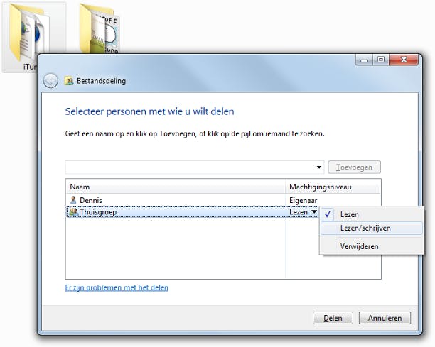 Thuisgroepen is een specifieke functie van Windows 7. Maakt u binnen het gebruik van andere computers, bijvoorbeeld met Windows XP en Windows Vista? Maak dan gebruik van de standaard netwerkfunctie van Windows. Klik met rechts op het bestand en kies Delen. Vervolgens configureert u de gedeelde mappen handmatig (op basis van een werkgroep, in plaats van een thuisgroep). Zo zorgt u ervoor dat alle computers toegang hebben tot gedeelde bestanden en apparaten.