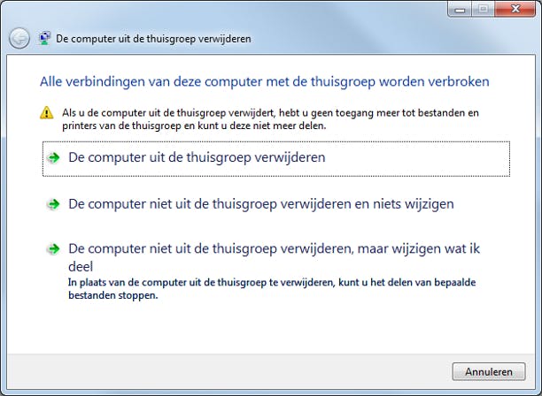 Computers die deel uitmaken van de thuisgroep, kunt u op elk gewenst moment hier weer uit verwijderen. Bijvoorbeeld wanneer u de computer alleen nog voor zakelijke doeleinden wilt gebruiken en de bestanden gescheiden wilt houden. In het hoofdvenster van Thuisgroep klikt u op De computer uit de thuisgroep verwijderen. Deze optie vindt u in de sectie Andere bewerkingen voor deze thuisgroep. Klik hierna op De computer uit de thuisgroep verwijderen.