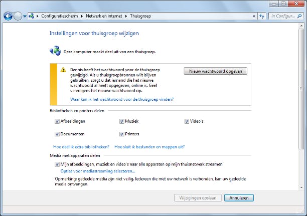 De andere computers in de thuisgroep zijn na het aanpassen van het wachtwoord buitengesloten. U dient hier het nieuwe wachtwoord nog in te voeren. Ga naar de andere computers en open het hoofdvenster van Thuisgroep. Boven in het venster leest u dat het wachtwoord door een andere computer is aangepast. Klik op de knop Nieuw wachtwoord opgeven. Op de andere computer wordt het wachtwoord nog getoond. Neem dit over in het getoonde wachtwoordvak. Klik op Volgende. De computer wordt toegevoegd aan de thuisgroep. Klik op Voltooien.