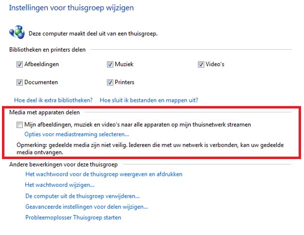 Interessant aan thuisgroepen is de mogelijkheid om media (zoals afbeeldingen, muziek en video's) naar andere apparaten binnen de thuisgroep te streamen. Zo kunt u de media afspelen op een andere pc, zonder de bestanden eerst te kopiëren of verplaatsen. Hiervoor maakt u gebruik van Windows Media Player. In het hoofdvenster van Thuisgroep plaatst u een vinkje bij de optie Mijn afbeeldingen, muziek en video's naar alle apparaten op mijn thuisnetwerk streamen. Klik hierna op Opties voor mediastreaming, zodat we in de volgende stap zelf wat dingen kunnen instellen.