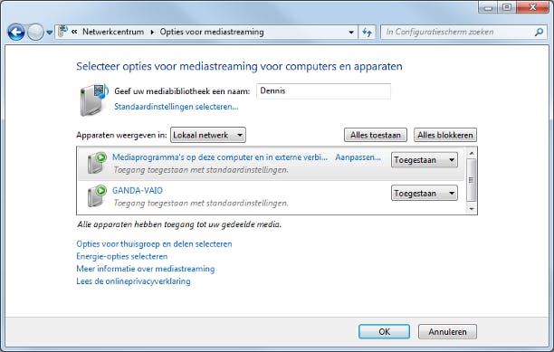 De bestanden uit uw mediabibliotheek kunnen nu worden gestreamd. Geef de mediabibliotheek een herkenbare naam. Hierna bepaalt u welke apparaten toegang hebben tot de streams en welke rechten zij hebben. In de lijst ziet u alle apparaten binnen het lokale netwerk. Kies telkens tussen Toegestaan en Geblokkeerd. De computers binnen uw thuisgroep hebben automatisch toegang. Via de knoppen Alles toestaan en Alles blokkeren kunt u in één keer een beleid op de hele selectie toepassen. Klik tot slot op OK.