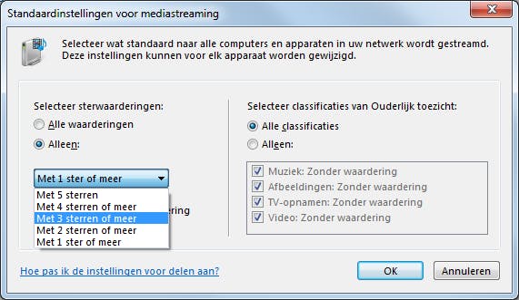 Als u gebruikmaakt van ouderlijk toezicht (en hiermee bepaalt welke inhoud uw kinderen wel of niet mogen zien), kunt u bepalen welke inhoud mag worden verspreid. Dit gebeurt op basis van classificaties of sterwaarderingen. In het venster Opties voor mediastreaming kiest u voor Standaardinstellingen selecteren. Kies of u op basis van sterwaarderingen of classificaties van Ouderlijk toezicht bestanden wilt streamen. Stel vervolgens de kwaliteitseis in.