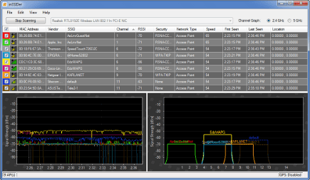 De nieuwste routers met simultane dualband bieden hoge doorvoersnelheden dankzij het gelijktijdig gebruik van de 2,4GHz- en 5GHz-band én meerdere antennes. In theorie kunnen hiermee snelheden tot 450 megabit gehaald worden, in de praktijk zal het tussen de 100 en 200 megabit liggen. Belangrijk is echter wel dat de router zo min mogelijk storing ondervindt (bijvoorbeeld van andere netwerken) bij het zenden en ontvangen. Hetzelfde geldt ook voor een oudere router of wanneer u nog een apart draadloos accesspoint gebruikt. Ooit is die geconfigureerd en zijn er keuzes gemaakt zoals het te gebruiken kanaal. Maar zeer waarschijnlijk zijn er in de omgeving andere apparaten en draadloze netwerken bijgekomen die nu de prestaties van uw draadloos netwerk nadelig beïnvloeden. InSSIDer, een gratis scanner voor draadloze netwerken. InSSIDer scant het 2,4- of 5GHz-spectrum en verzamelt informatie over de draadloze netwerken die het daarbij aantreft. Van ieder netwerk laat het de SSID zien maar ook het gebruikte kanaal, de beveiliging, de snelheid, het MAC-adres van de router en de naam van de leverancier. Vooral het kanaal is interessant, bij de configuratie van uw eigen draadloos netwerk kunt u hier namelijk mee variëren. Bijvoorbeeld 802.11g onderscheidt 14 (overlappende) kanalen waarvan de kanalen 1, 6 en 11 voldoende ver uit elkaar liggen om elkaar zo min mogelijk te storen. Door InSSIDer alle netwerken te laten scannen en vervolgens de weergave te sorteren op Channel, kunt u zien hoe druk de verschillende kanalen zijn. Bovendien geeft de RSSI-waarde de sterkte van de verschillende signalen weer. Combineer deze gegevens en bepaal wat het beste kanaal is voor uw nieuwe of huidige draadloze netwerk. Hebt u helemaal geen 802.11g-appatuur meer in huis, dan kunt u volstaan met alleen het 802.11n-netwerk te configureren. En ook omgekeerd, zijn er nog geen 802.11n-apparaten of maar heel weinig, kan het voor extra stabiliteit ook een overweging zijn die mogelijkheid nog onbenut te laten tot er meer apparaten de nieuwe snelste standaard ondersteunen.