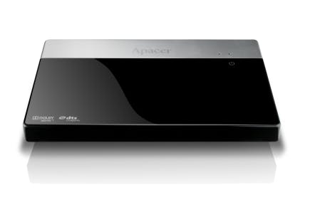 De Apacer AL720 heeft een smalle voet waarin alle aansluitingen zijn geïntegreerd, zoals composiet en component via stekkertjes van 3,5 millimeter. Uiteraard ontbreekt voor de beste weergave van audio en video een HDMI-aansluiting niet. Het eerste dat opvalt, is dat er geen ethernetpoort voorhanden is. Wel is het mogelijk om het apparaat via een optionele wifi-adapter alsnog in uw thuisnetwerk te hangen. In de brede bovenkant van de speler is een 2,5inch-schijf van Western Digital geïntegreerd met een opslagcapaciteit van 500 GB. U bereikt de binnenkant door met een smalle schroevendraaier vijf boutjes los te draaien en het deksel omhoog te tillen. Overigens is het niet de bedoeling dat u zelf de schijf vervangt. Het onderdeel is namelijk verzegeld en stevig vastgemonteerd, waardoor u risico loopt om de boel te beschadigen. De AL720 draait op de Realtek 1073DD-mediaprocessor. Er is prima ondersteuning voor blu-ray-films. Bij een mappenstructuur zoekt de speler zelf het startbestand op. De navigatie binnen blu-ray-films mag wel iets beter. Zo moet u twee keer op de next-knop van de afstandsbediening drukken om naar het volgende hoofdstuk te gaan. Ook is het door aparte aanduidingen lastig om Nederlandstalige ondertiteling te selecteren. Bijna alle gangbare bestandstypes werken probleemloos, alleen een cd-rip met flac-bestanden kregen we niet aan de praat. Verder is er slechts één usb-aansluiting aanwezig, waardoor er bij gebruik van de optionele wifi-adapter geen plaats is voor externe datadragers.