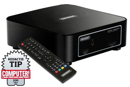 Eminent bracht dit voorjaar diverse nieuwe modellen op de markt, waaronder de EM7180. Logischerwijs is deze mediaspeler de opvolger van de EM7080. De opvallendste wijziging is dat er een andere chipset wordt gebruikt, namelijk de Realtek 1183DD C+. Alle video- en audioformaten verwerkt deze mediaspeler keurig, zoals blu-ray-rips en AVCHD-bestanden. Via een geschikte versterker kunt u uit de voeten met uitgebreide decodeeropties, zoals DTS HD Master Audio en Dolby TrueHD. De gebruikersinterface ziet er prima uit. De vlotte reactietijd werkt lekker en u wisselt desgewenst eenvoudig van thema. Overigens kondigde Eminent onlangs aan dat er in mei nieuwe firmware verschijnt met een gloednieuw menu. Qua uiterlijk is er weinig verschil met de EM7080, hoewel er een usb-poort van de voorkant naar de achterzijde is verhuisd. U maakt de speler open door vier schroefjes los te draaien. Het deksel moet u subtiel optillen, want anders beschadigt u wellicht het kabeltje van de mini-ventilator. Met de applicaties NZBGet en Transmission downloadt u uit de nieuwsgroepen of het bittorrent-netwerk. Verder surft u met een browser op internet. Pluspunten zijn verder de Nederlandstalige handleiding en vijf jaar garantie. Een belangrijk voordeel is bovendien dat er geen extra kosten voor kabels bijkomen, want Eminent is een van de weinige merken die alles netjes meelevert. Het product is met én zonder interne harde schijf verkrijgbaar.