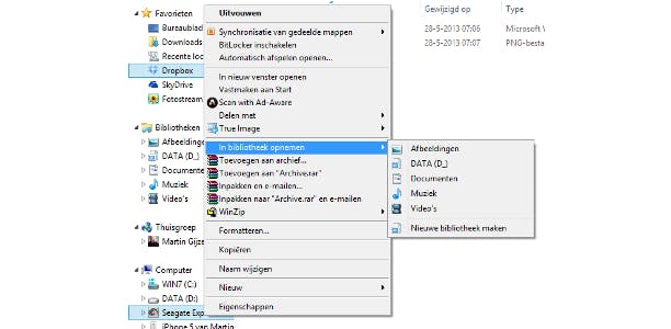 Je doet dit door in de Windows Verkenner te rechtsklikken op een station en vervolgens te kiezen voor In bibliotheek opnemen / Nieuwe bibliotheek maken. Vervolgens wordt er een nieuwe bibliotheek aangemaakt in de Windows Verkenner. Er is nog een iets geavanceerdere manier om dit te doen, door eerst een Opslagruimte aan te maken in Windows, maar dat is ingewikkelder en is meer bedoeld om uw pc te veranderen in een server en dat is niet waar we nu naar op zoek zijn.