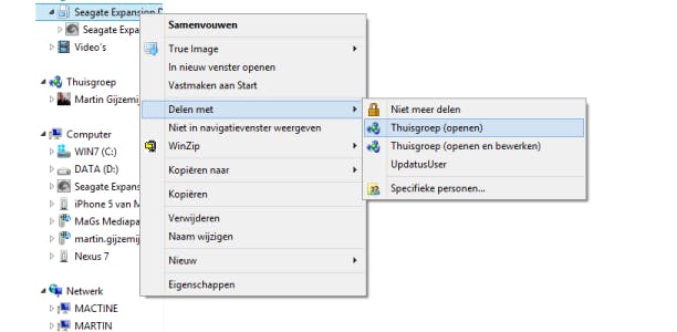 Nu de betreffende schijf is toegevoegd aan de bibliotheek, is het kinderlijk eenvoudig om de inhoud daarvan te delen. Het enige dat je hoeft te doen is met de rechtermuisknop te klikken op de bibliotheek die je wilt delen en daarna te klikken op op Delen met / Thuisgroepen. Iedereen in het netwerk die lid is van de Thuisgroep waarmee je de schijf hebt gedeeld, kan deze nu benaderen en ervan lezen en erop schrijven.