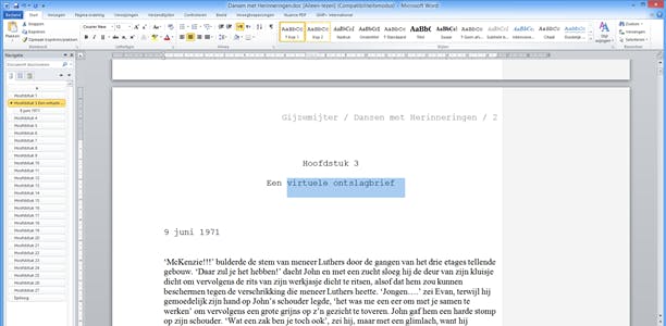 Laten we dat eens heel eenvoudig doen met hoofdstuktitels. Stel je hebt vier hoofdstukken, en elk hoofdstuk begin je met de kop Hoofdstuk (plus het bijbehorende getal uiteraard). Dan heb je voor jezelf een indeling gemaakt.