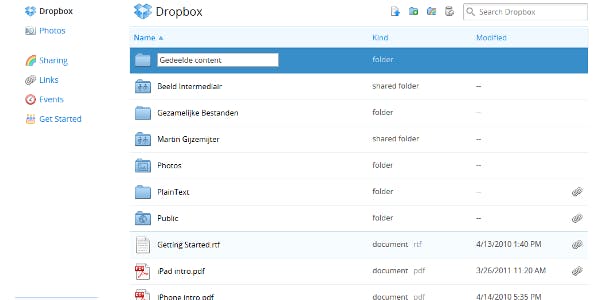 Zo houd je het een beetje beheersbaar, maar toch volautomatisch. Het is dan ook verstandig om een map aan te maken met een herkenbare naam, zodat je altijd weet welke map gedeeld wordt. Je maakt een nieuwe map aan in Dropbox door, nadat je bent ingelogd op de website, te klikken op het pictogram van een map met een plusteken daarin, rechtsboven. Vervolgens geef je de map een herkenbare naam, bijvoorbeeld gedeelde content.