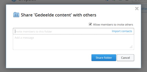 Via de bovenstaande optie kunnen gebruikers de inhoud van de map zien, maar daar zelf niets aan veranderen. Wil je een map maken waarin andere gebruikers ook iets kunnen toevoegen of veranderen, dan werkt dat via de optie Invite to folder.