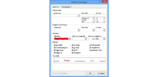 Hier kun je allerlei opmaakelementen selecteren. Wij gaan voor kleur en dat bevindt zich onder Lettertype. Kies de kleur waarop je wilt fileren en klik op OK. Word zal nu alleen maar zoeken op de aangegeven woorden met de opmaakstijl (kleur in dit geval) die je hebt aangegeven. Andersom werkt dit overigens ook heel handig, door een kleur aan te geven bij het veld Vervangen door, kun je in één klap een bepaald woord in het hele document een kleur geven. Dat scheelt je veel tijd en werk.