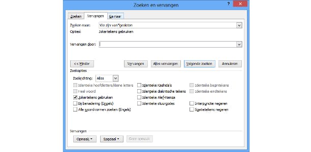 Ga naar het venster Geavanceerd zoeken (zoals eerder beschreven) / tabblad Vervangen. Klik op de knop Meer linksonder om extra opties uit te klappen (tenzij deze al uitgeklapt zijn). Plaats een vinkje bij Jokertekens gebruiken. In het veld Zoeken naar typ je We zijn van*gesloten. Wat je nu doet is tegen Word zeggen dat alle zinnetjes die beginnen met We zijn van en eindigen met gesloten binnen de zoekopdracht vallen. Vul je nu niets in bij Vervangen door en klik je op Alles vervangen, dan worden alle geselecteerde zinnetjes vervangen door niets en heb je dus al die zinnen effectief verwijderd.