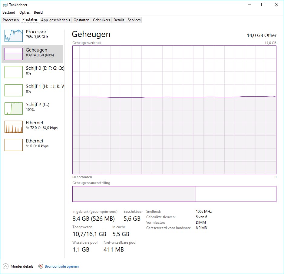 Je controleert eenvoudig of er bij jouw systeem sprake is van geheugentekort. Open alle programma’s die je normaliter tegelijkertijd gebruikt, bijvoorbeeld een fotobewerker, muziekdienst, chatclient, tekstverwerker, e-mailprogramma en browser met meerdere tabbladen. Zodra alles is opgestart, druk je op de sneltoets Ctrl+Shift+Esc voor het openen van de tool Taakbeheer. Navigeer naar het tabblad Prestaties en klik op Geheugen. Je ziet precies hoeveel geheugencapaciteit er nog beschikbaar is. Wanneer zo’n tachtig procent van het geheugen is gereserveerd, loont het de moeite om extra geheugen bij te plaatsen. Bezoek de website www.geheugen.com om uit te zoeken welke ram-modules er compatibel zijn met jouw pc. Ook bij sommige laptops kun je het geheugen overigens uitbreiden.