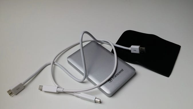 Transcend levert een Thunderbolt -kabel, usb3.0-kabel en een hoesje mee.