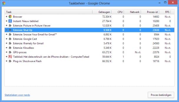 Dat Windows een optie Taakbeheer bevat waarmee je de prestaties van (en belasting door) programma's kunt bekijken, was je waarschijnlijk wel bekend. Maar wist je dat Google Chrome ook z'n eigen Taakbeheer heeft? Lees ook: De 15 beste extensies voor Google Chrome.