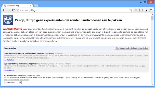 Je kunt ze tevoorschijn halen door in de Omnibar (de adresbalk van Chrome) te typen: chrome://flags. Je komt dan op een pagina terecht vol experimentele functies. Een groot deel hiervan zal je waarschijnlijk niets zeggen, maar er zitten zeker wat interessante tussen, zoals het hervatten van afgebroken downloads, het stapelen van tabbladen als er niet voldoende ruimte is, enzovoort.