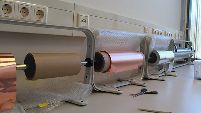 Boven een lange tafel hangen verschillende rollen met koperkleurige en aluminium platen die de studenten gebruiken als geleidingsmateriaal. Daardoor zien de nieuwe batterijen er nu nog vooral uit als kleine plaatjes zilverfolie, maar volgens Wagemaker is dat genoeg om de voltages te testen. Het zijn ook deze plaatjes die uiteindelijk in de andere ruimtes met neutronen worden beschoten.