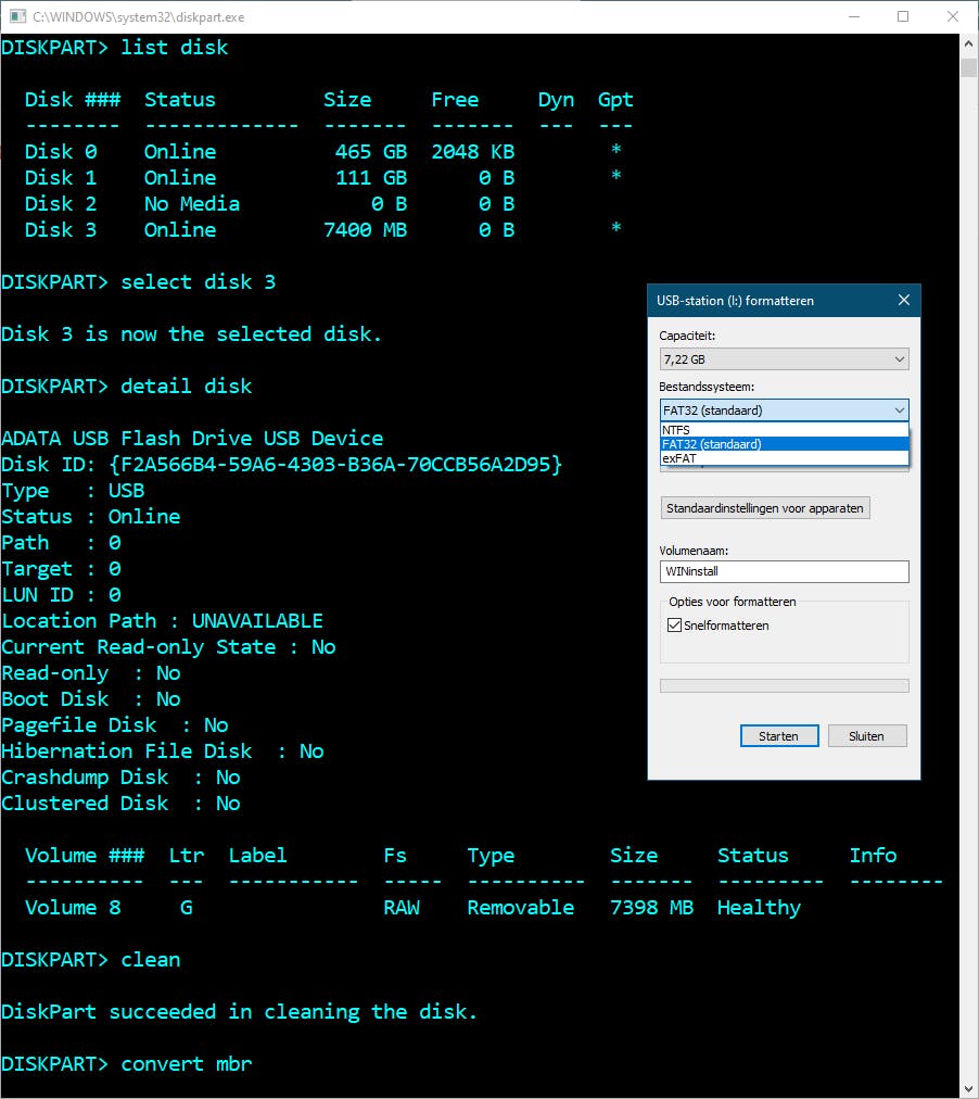Belangrijk is dat je [n] vervangt door het disk-nummer van de usb-stick. Om zeker te zijn dat je wel het juiste station te pakken hebt, vraag je met het commando detail disk extra informatie op. Na afloop formatteer je het nieuwe station via Verkenner als fat32, zodat de stick ook op UEFI-systemen kan booten.