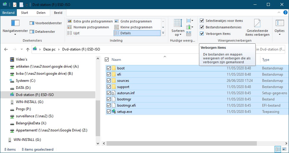 Gaat het om een Windows-installatie, dan kun je zo’n stick ook zonder externe hulpmiddelen voorbereiden. Bewerk eerst je stick met de tool diskpart, zoals beschreven in de paragraaf ‘Partitiestructuur’. De rest van de voorbereidingen doe je vanuit Verkenner. Formatteer de stick met fat32, zodat die ook op een UEFI-systeem zal booten. Stel Verkenner via het menu Beeld bij voorkeur zo in dat die ook Verborgen items toont. Vervolgens dubbelklik je op je iso-bestand zodat dit aan een virtueel cd-station wordt gekoppeld. Navigeer naar dit station, druk op Ctrl+A zodat je de complete inhoud selecteert en kopieer alles naar je stick. Je beschikt nu over een werkend installatiemedium.