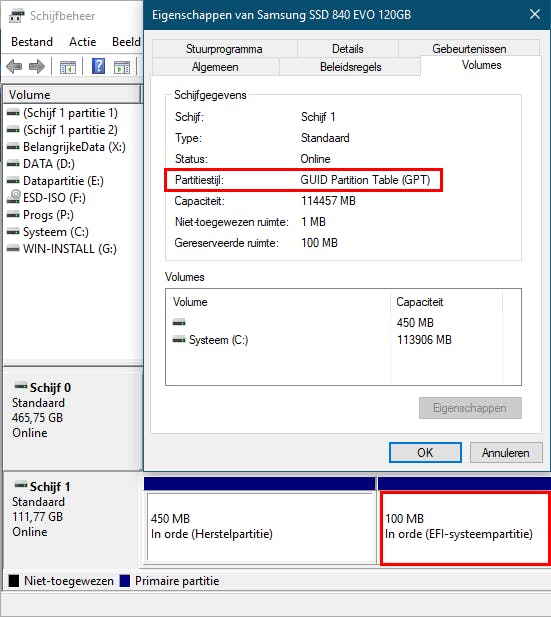 Om na te gaan welke partitiestructuur een schijf bevat, kun je op Windows-toets+R drukken en diskmgmt.msc uitvoeren. In het venster van Schijfbeheer klik je linksonder met rechts op de gewenste schijf en kies je Eigenschappen: je leest de Partitiestijl af op het tabblad Volumes.