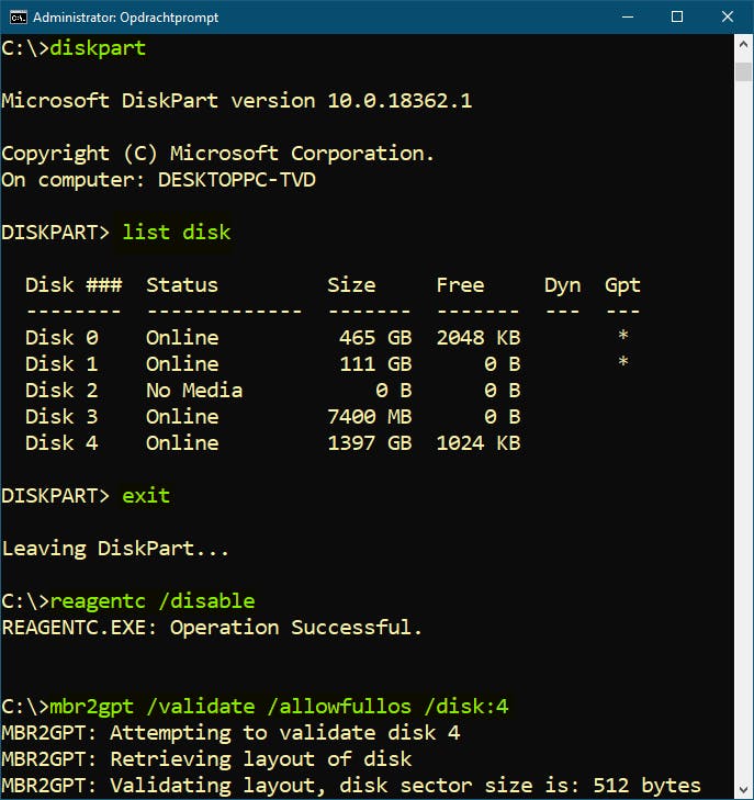 Wil je dezelfde schijf inclusief Windows behouden in het nieuwe UEFI-systeem, dan kun je een conversie naar gpt overwegen. We gaan er hierbij wel van uit dat je huidige Windows-architectuur overeenkomt met die van de UEFI-firmware (zie ook de paragraaf ‘Architectuur’). Start hiervoor Opdrachtprompt op als administrator en voer het volgende commando uit: