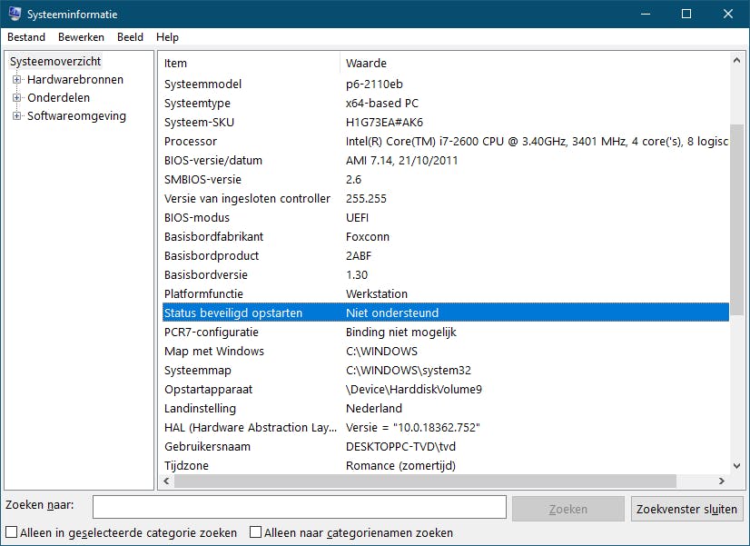 Over naar een ander scenario: je hebt Windows geïnstalleerd en je wilt daarnaast ook Linux installeren in een dualboot-opstelling. Start je Windows in UEFI-modus op (zie de paragraaf ‘Architectuur’), dan controleer je via msinfo32 het best ook de status van het item Status beveiligd opstarten. Blijkt die niet ingeschakeld, dan is de secure-boot-functie van UEFI niet geactiveerd.