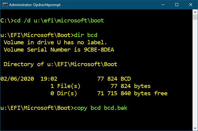 Hierbij vervang je [n:] door een vrije stationsletter. Dit commando zorgt ervoor dat de efi-systeempartitie aan de opgegeven stationsletter wordt gekoppeld. Vervolgens tik je de stationsletter in (bevestigd met Enter), gevolgd door nog twee opdrachten: