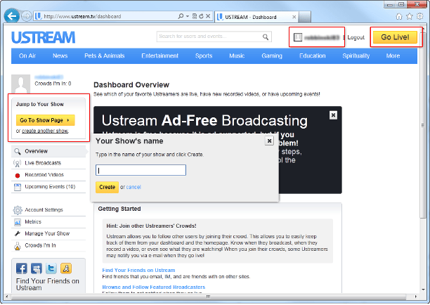 Voordat u een live-uitzending kunt starten, dient u eerst een nieuwe show aan te maken. Dit klinkt ingewikkeld, maar is het niet. Een show is een soort 'raamwerk' dat u slechts één keer hoeft aan te maken. In het raamwerk draait uw uitzending: de live-beelden vanaf uw webcam. De show hoeft niet permanent online te zijn, u kunt de stream hervatten wanneer u wilt. Meldt u aan bij Ustream.tv met uw gebruikersnaam en wachtwoord (dit gaat de eerste keer automatisch na de registratie) en klik naast Logout op uw gebruikersnaam.