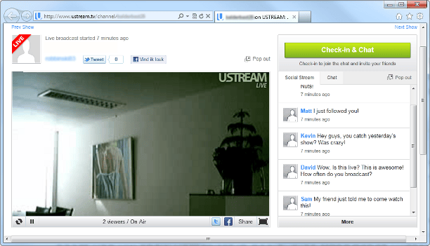 De kijkers naar uw videostream hebben de link nodig naar uw uitzending. Klik op de naam van de show boven het monitor-scherm. Er wordt een nieuw venster geopend. Het adres in de webbrowser is het adres naar uw show. Kopieer het adres met de rechtermuisknop en plak het in een mailtje, op uw weblog, website of Facebook. Kijkers hoeven zich niet te registreren bij Ustream om het webcambeeld te ontvangen. Na het aanklikken van uw link wordt uw webcambeeld direct getoond.