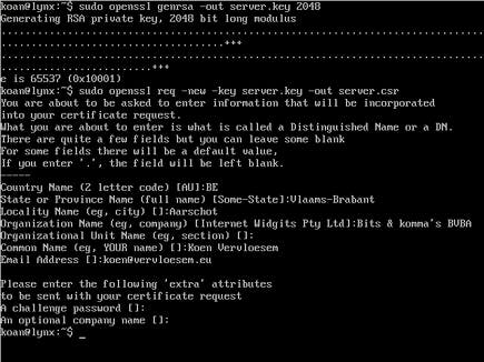 We versturen de mail via onze Ubuntu-server op een veilige, versleutelde manier, namelijk via TLS. Hiervoor moet u een sleutel en certificaat voor uw server aanmaken. Een 2048bit-sleutel zonder wachtwoord aanmaken gaat met het commando sudo openssl genrsa -out server.key 2048. Daarna maken we een 'Certificate Signing Request' aan met het commando sudo openssl req -new -key server.key -out server.csr. Vul uw gegevens in. Vul op het einde niets in voor challenge password en company name: u kunt daar gewoon op Enter drukken.