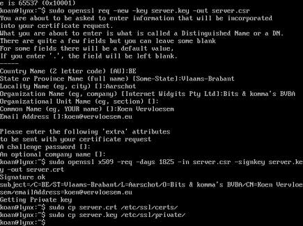 U kunt uw certificaat tegen vergoeding laten ondertekenen. Dat kost echter geld en is enkel belangrijk om de identiteit van uw website te bewijzen aan bezoekers. Omdat we het certificaat voor onze eigen mailserver gebruiken ondertekenen wij het zelf. Dat kan met het volgende commando: sudo openssl x509 -req -days 1825 -in server.csr -signkey server.key -out server.crt. Kopieer tot slot de sleutel en het certificaat (5 jaar geldig) naar de juiste plaats met de volgende commando's: