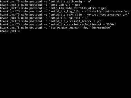 sudo postconf -e 'smtpd_tls_auth_only = no' && sudo postconf -e 'smtp_use_tls = yes' && sudo postconf -e 'smtp_tls_note_starttls_offer = yes' && sudo postconf -e 'smtpd_tls_key_file = /etc/ssl/private/server.key' && sudo postconf -e 'smtpd_tls_cert_file = /etc/ssl/certs/server.crt' && sudo postconf -e 'smtpd_tls_loglevel = 1' && sudo postconf -e 'smtpd_tls_received_header = yes' && sudo postconf -e 'smtpd_tls_session_cache_timeout = 3600s' && sudo postconf -e 'tls_random_source = dev:/dev/urandom'