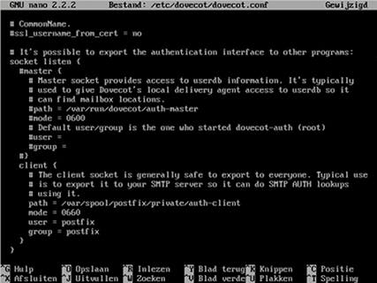 De SMTP-AUTH-ondersteuning van Postfix is gebaseerd op SASL (Simple Authentication and Security Layer). We installeren Dovecot SASL met het commando sudo apt-get install dovecot-common. Open daarna het configuratiebestand met het commando sudo nano /etc/dovecot/dovecot.conf en zoek naar de sectie auth default. Verander daarin de regel mechanisms = plain naar mechanisms = plain login. De subsectie socket listen daaronder moet eruitzien zoals in de schermafbeelding. Sla het bestand hierna op. Open nu /etc/default/dovecot en wijzig daarin #ENABLED=0 naar ENABLED=1.